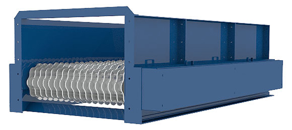 采用碟盤對(duì)結(jié)構(gòu)來(lái)設(shè)定篩孔尺寸,用于篩分小于所設(shè)定篩孔尺寸的垃圾物料。本碟型篩處理量是相同體積傳統(tǒng)滾筒篩的3倍,篩分效率更是滾筒篩的1.5倍。碟選機(jī)的碟形篩會(huì)旋轉(zhuǎn),帶動(dòng)篩上垃圾震動(dòng)。碟形篩之間有間距,根據(jù)垃圾尺寸和重量,達(dá)到分選的目的。根據(jù)不同寬度,一根軸承上可以安裝15到20個(gè)不等的篩盤。根據(jù)所需的篩分處理量,安裝不同數(shù)量的軸承。電機(jī)驅(qū)動(dòng)軸承同步旋轉(zhuǎn)。其他形狀篩盤的篩分設(shè)備很容易被濕的垃圾堵塞篩孔,而碟形篩盤由于不停轉(zhuǎn)動(dòng),因此不會(huì)有篩孔堵塞的情況發(fā)生。