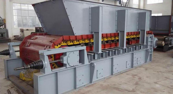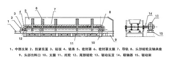 板式給料機(jī)在運(yùn)行過(guò)程中,采用高強(qiáng)度推土機(jī)模鍛鏈條為牽引件,兩根鏈條繞過(guò)安裝在機(jī)體頭部的一對(duì)驅(qū)動(dòng)鏈輪和機(jī)體尾部的一對(duì)張緊輪聯(lián)成封閉型回路,在兩排鏈條的每個(gè)鏈節(jié)上裝配了相互交迭的、重型結(jié)構(gòu)的輸送槽,從而成為一個(gè)連續(xù)的能夠運(yùn)載物料的輸送線路。其自重和物料的重量由安裝在機(jī)體上多排支重輪、鏈托輪和滑道梁支承。傳動(dòng)系統(tǒng)經(jīng)交流變頻調(diào)速電動(dòng)機(jī)聯(lián)接減速機(jī),再由漲套與驅(qū)動(dòng)裝置直聯(lián)驅(qū)動(dòng)運(yùn)載機(jī)構(gòu)低速運(yùn)行。將尾部料倉(cāng)卸入的物料沿輸送線路運(yùn)至機(jī)體的前方排出,實(shí)現(xiàn)向下方的工作機(jī)械連續(xù)均勻喂料的目的。